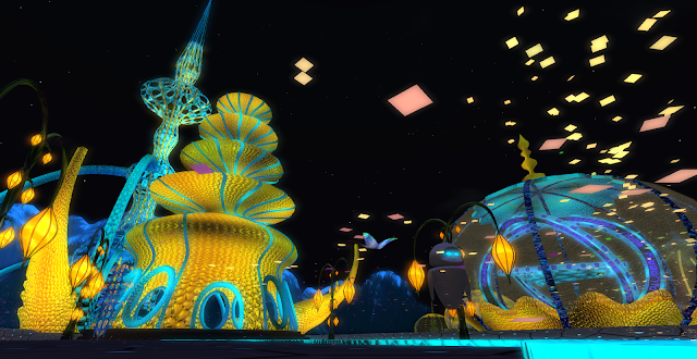 The many disparate elements of the build are pulled together by a ground mesh in the style of a celtic knot, glowing like a sapphire at sea level.